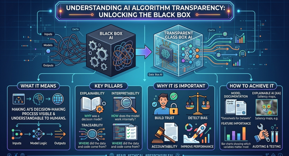 AI algorithm transparency helps organizations explain automated decisions and build trust in artificial intelligence systems across industries.
